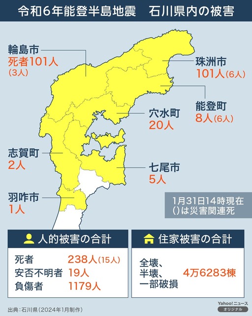 石川県によりますと、県内で死亡が確認された人の数は、31日午後2時の時点で、30日と変わらず238人となっています。